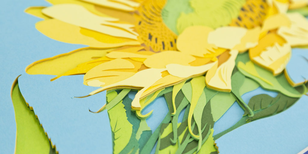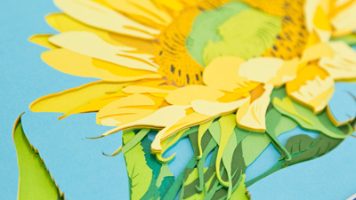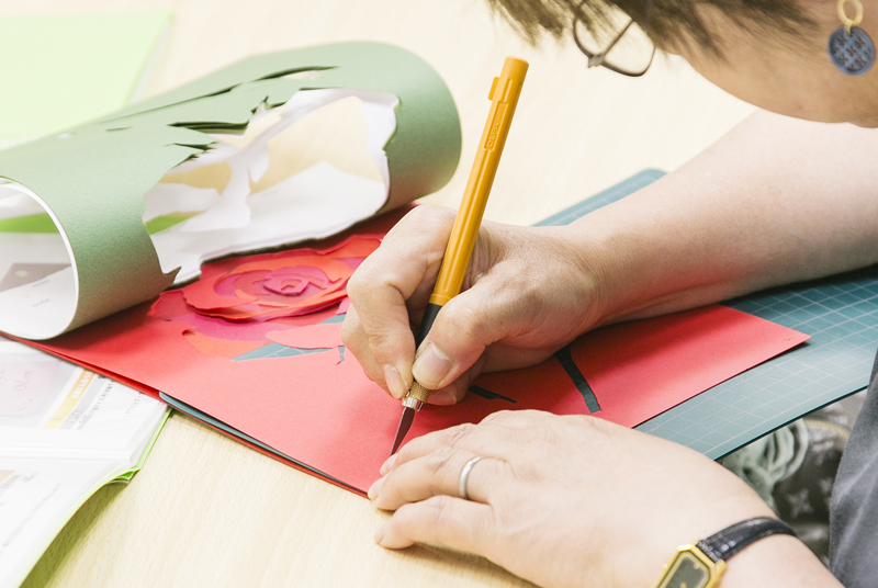 紙を重ねてアートナイフで彫り(切り抜き)、奥行きのある、色彩の美しい作品を作ります。重なった紙の美しい断面も「彫紙(ちょうし)アート」の特徴の1つです。紙の色や種類が豊富な日本だからこそ作れるアートです。