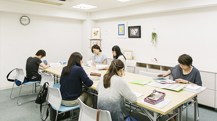 直営教室では、基礎からインストラクター養成講座まで学ぶことができます。教室では、常時500色以上の紙をご用意しております。じっくり紙選びができるよう、一人ずつお使いいただける色見本もございます。
